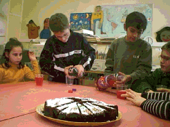 Pour les anniversaires, nous sommes tous réunis autour des tables. Hervé achète un gâteau et la boisson ou nous pouvons en faire. Si on veut, on peut ramener des bonbons. Nous coupons les parts de gâteau et nous distribuons les bonbons et la boisson. Bon anniversaire à tous!
