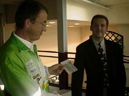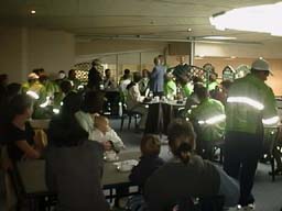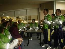 Dans une salle de l'Hyper U de Mayenne, tout le monde discute: coureurs, organisateurs et sponsors. |