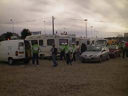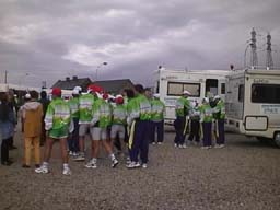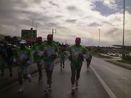 Les coureurs sont réunis près des véhicules pour aller courir dans la ville. |